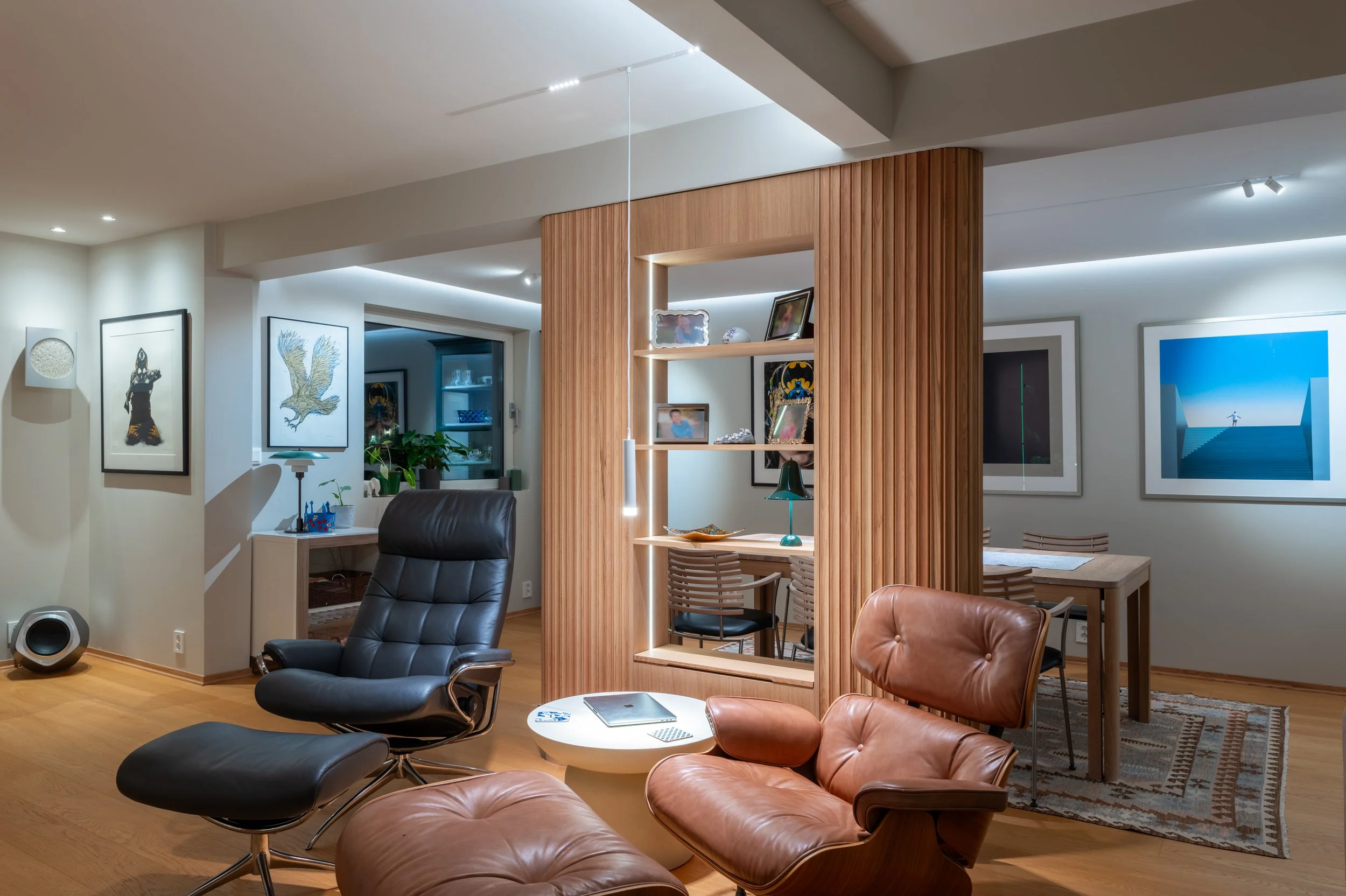 – Utgangspunktet var egentlig å gjøre noe vi syntes var stygt, til noe fint. Bæresøylene opplevdes som et problem i rommet, og målet var å integrere de på en måte som både fungerte praktisk og estetisk, sier Knut-Helge.